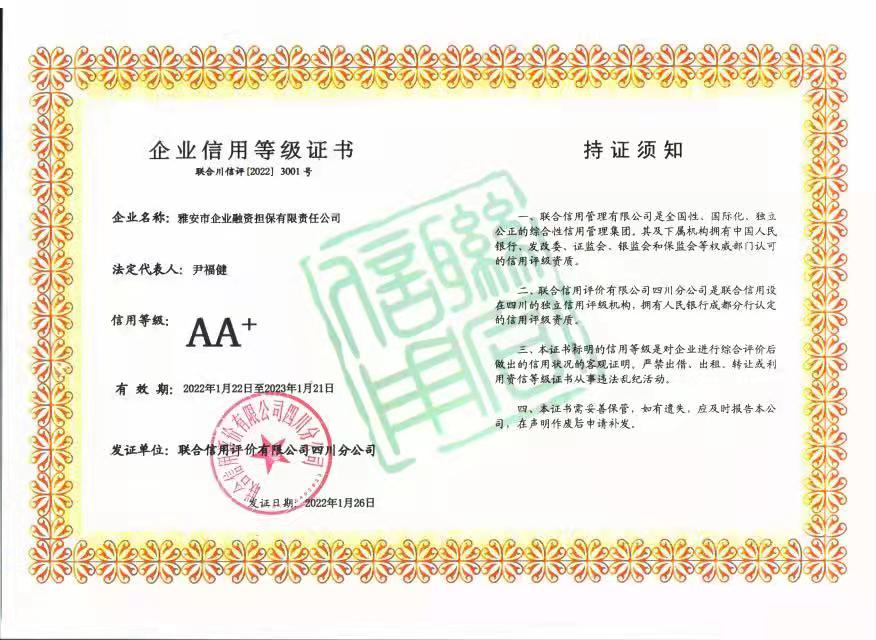 聯(lián)合信用評(píng)價(jià)有限公司是我國(guó)信用行業(yè)資質(zhì)最全、服務(wù)區(qū)域最廣,覆蓋規(guī)模最大的信用信息服務(wù)機(jī)構(gòu)之一。近期,該公司先后為四川省信用再擔(dān)保有限公司、成都市現(xiàn)代農(nóng)業(yè)融資擔(dān)保有限公司、瀘州市興瀘融資擔(dān)保集團(tuán)有限公司、眉山市眉州融資擔(dān)保有限公司等20余家川內(nèi)擔(dān)保機(jī)構(gòu)開(kāi)展2022年度評(píng)級(jí)工作,共評(píng)出了兩家AA+擔(dān)保機(jī)構(gòu),其中就有雅安市擔(dān)保公司。