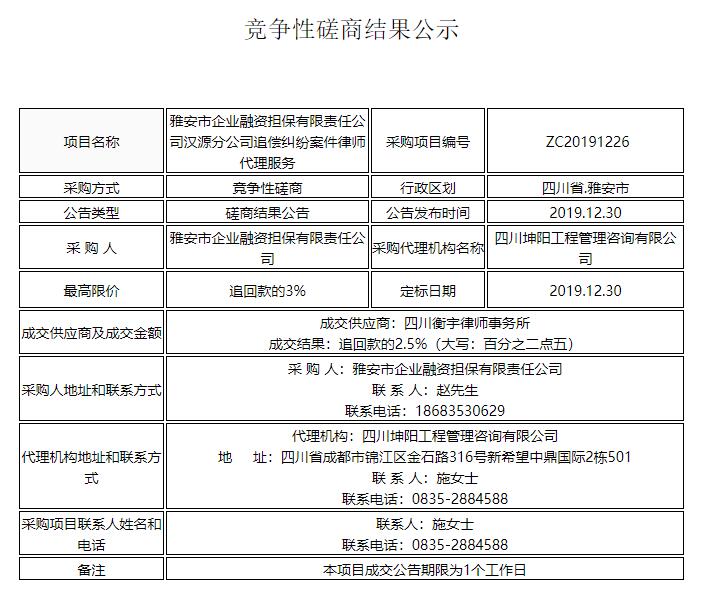 雅安市企業(yè)融資擔保有限責任公司漢源分公司追償糾紛案件律師代理服務競爭性磋商結果公示
